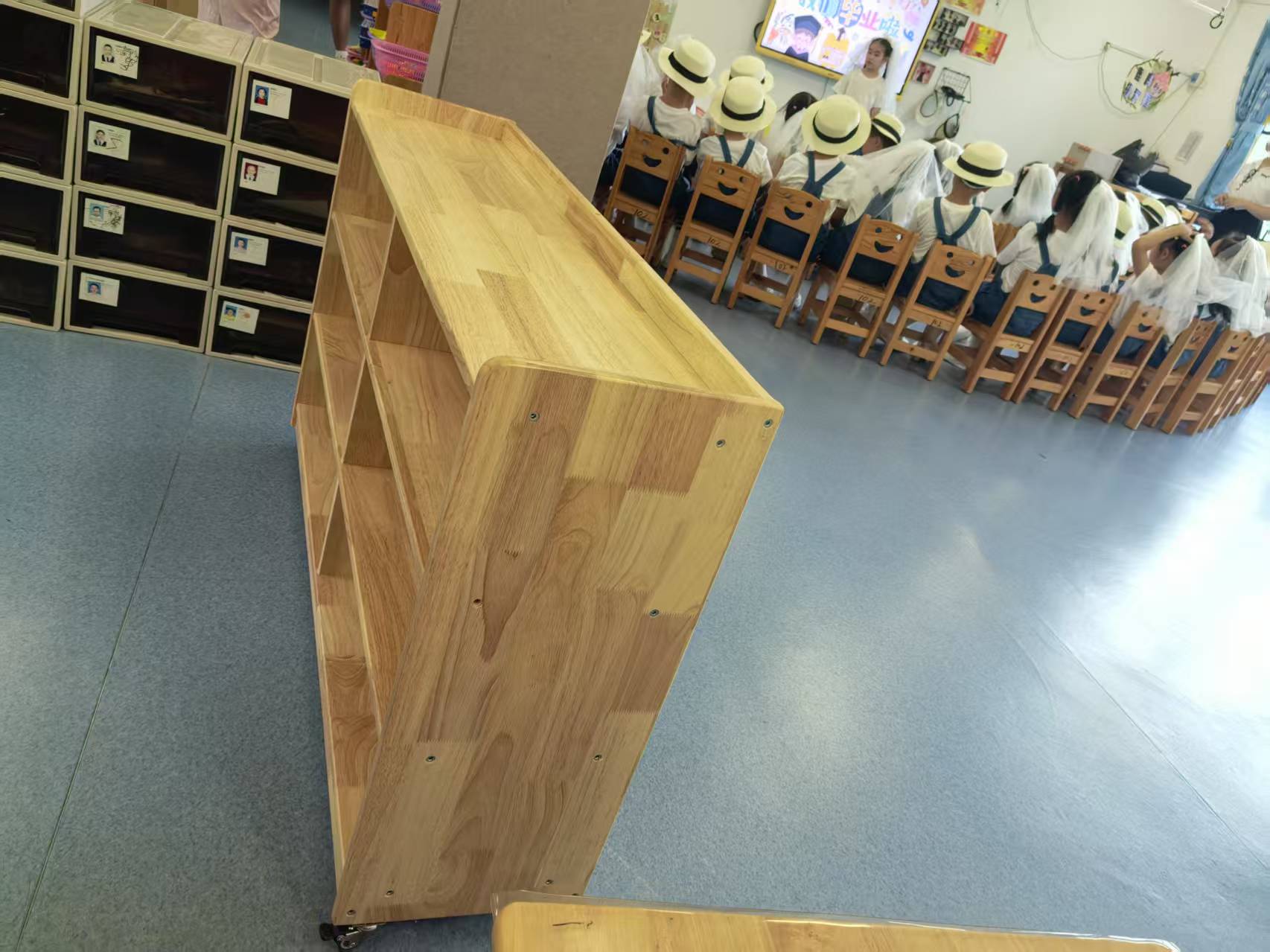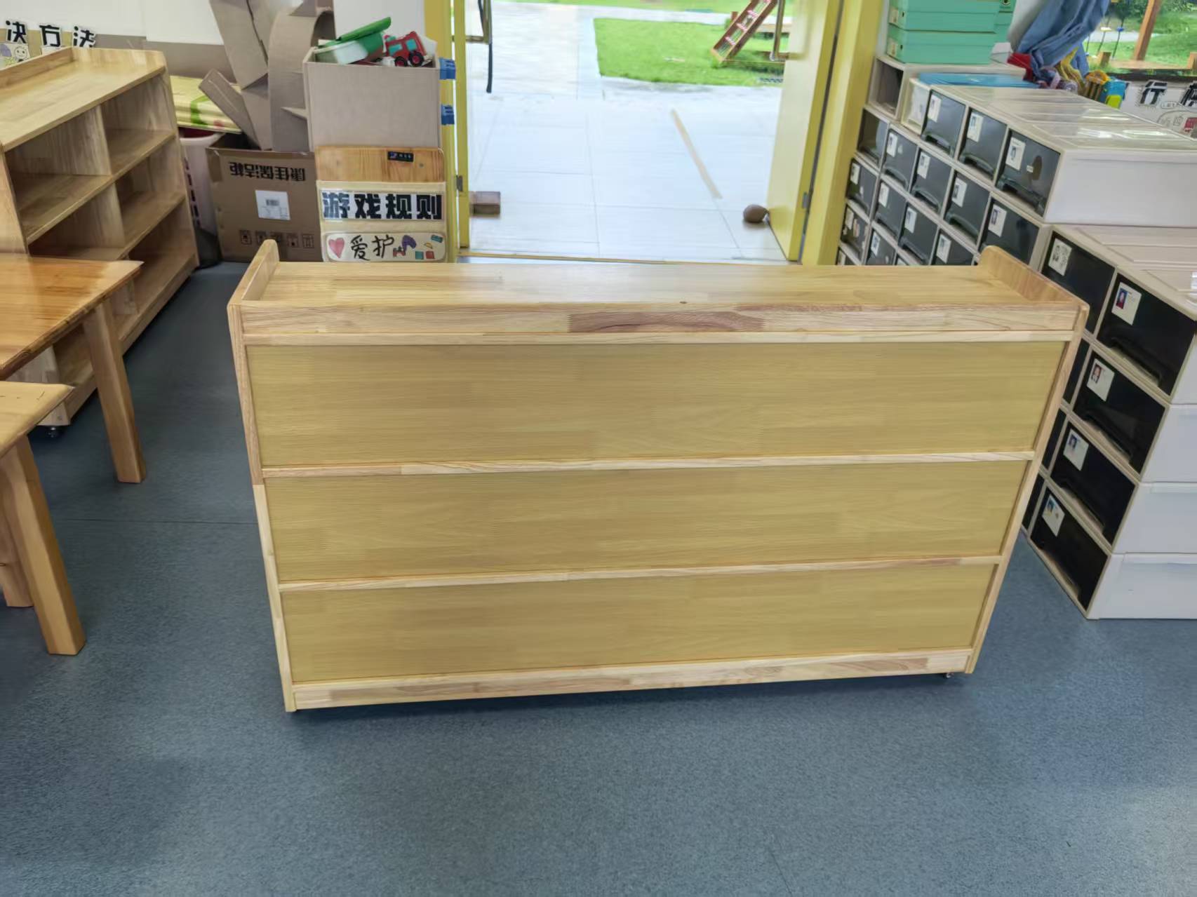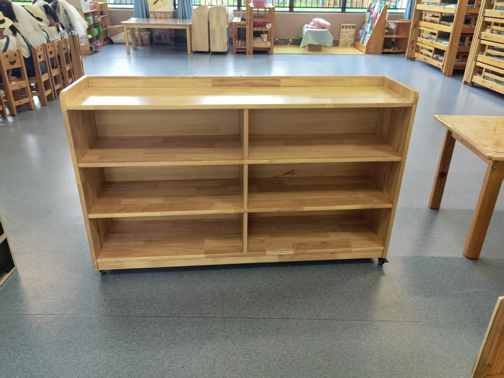 欣金泰,规格:1200*300*750mm(含轮子高度),材质:1.面板16mm橡木拼板制作,健康环保,纹理细致优美、色泽均匀、坚固耐用;2.柜子共有三层6格,底层有带5mm中纤双面橡木纹,3层带背板;3.柜子进行倒圆处理,完全符合幼儿家具工艺标准,安全呵护小朋友。原木色