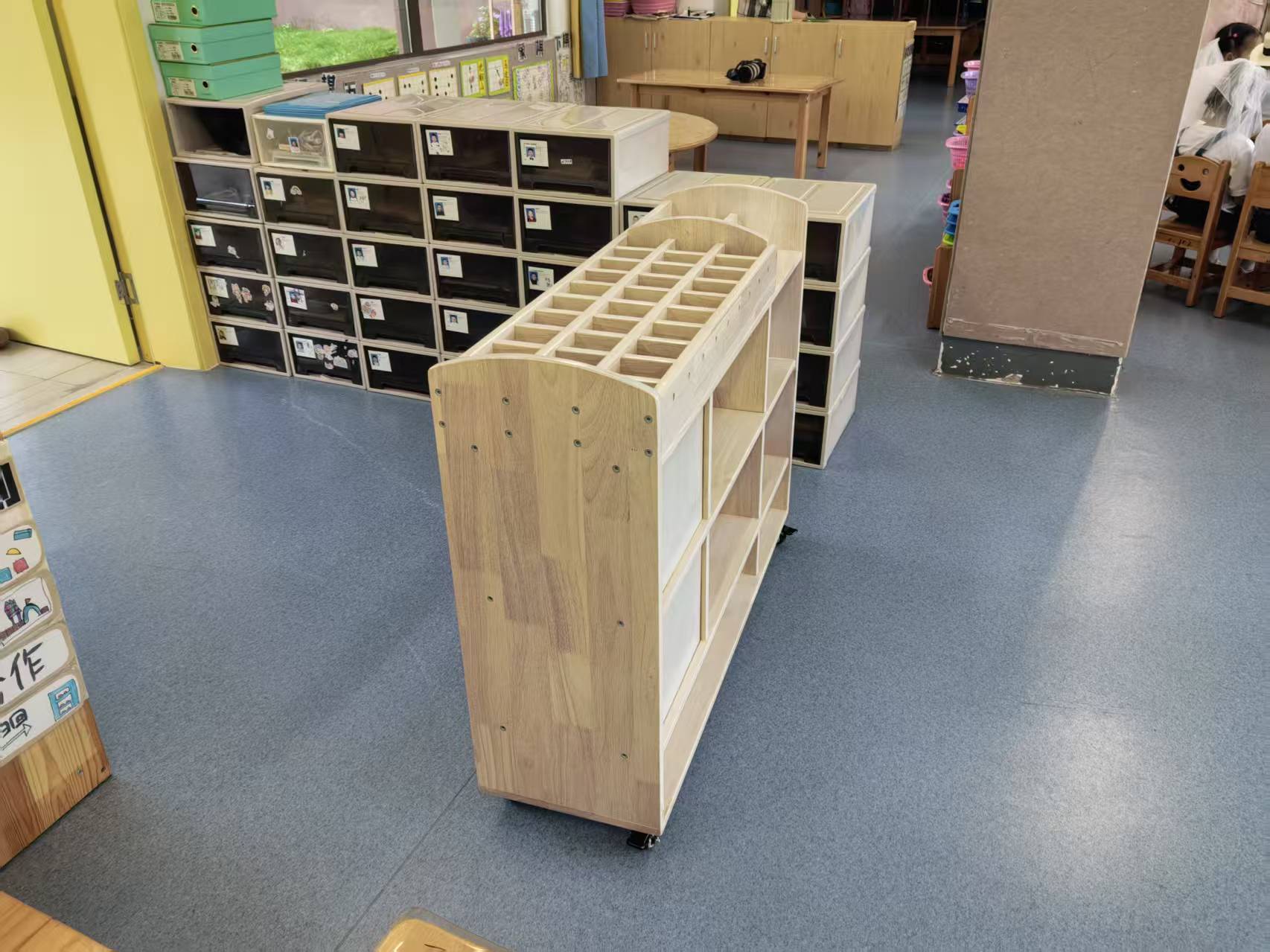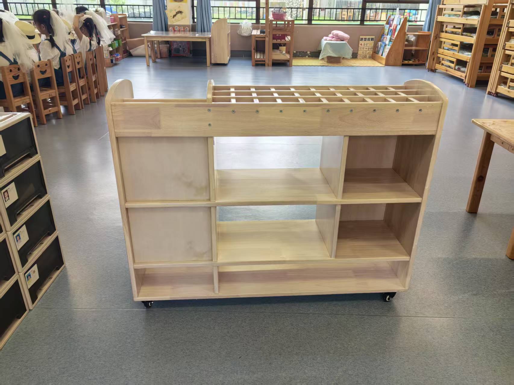 欣金泰,规格:1000*300*800mm(高度包含轮子),1.整体采用16mm橡木拼板制作,健康环保,纹理细致优美、色泽均匀、坚固耐用;2.所有朝外边角经过倒圆处理,符合幼儿家具的工艺标准;3.美术材料收纳柜共三层,上面一层带凹槽,可放置画笔、颜料,一、二层可放置其他美术材料用品;4.柜子底部配2.5寸医用平板静音脚轮,能自由移动。原木色